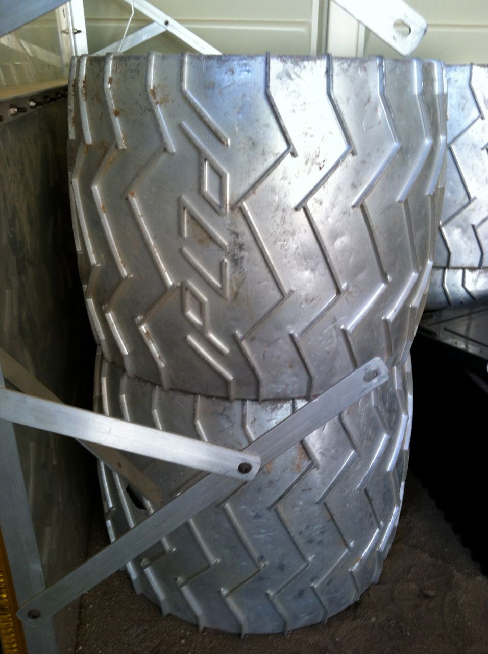 Original engineering model tires in the back of a garage in the Mars Yard at JPL. photo credit: Hellwinger